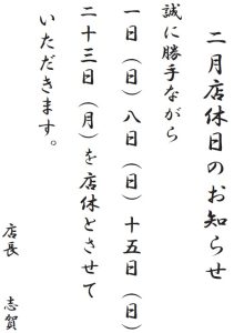 • 2月の逸品料理と店休日のお知らせ